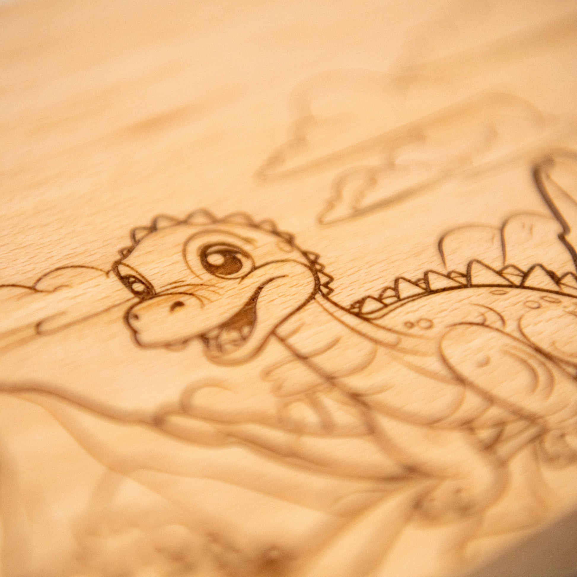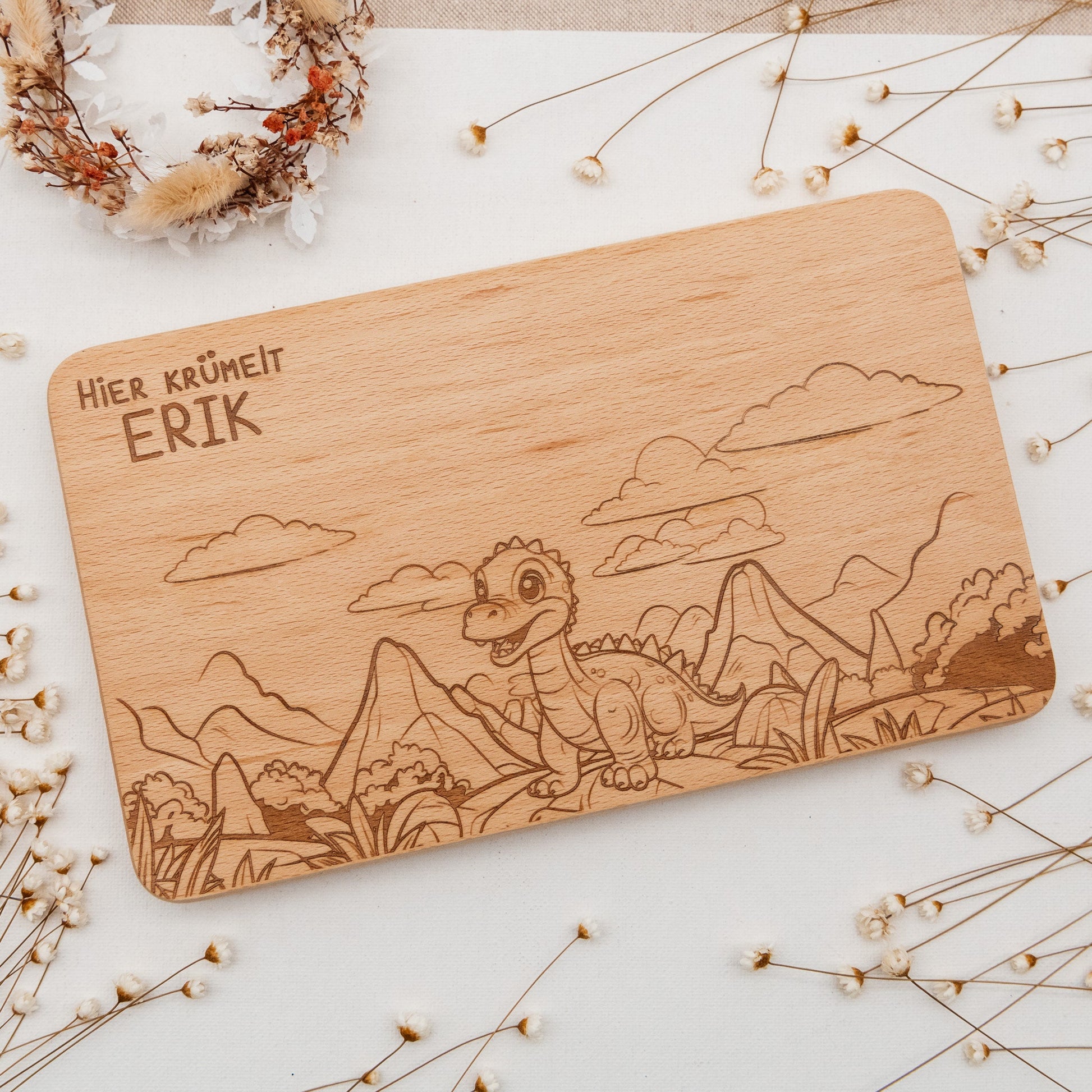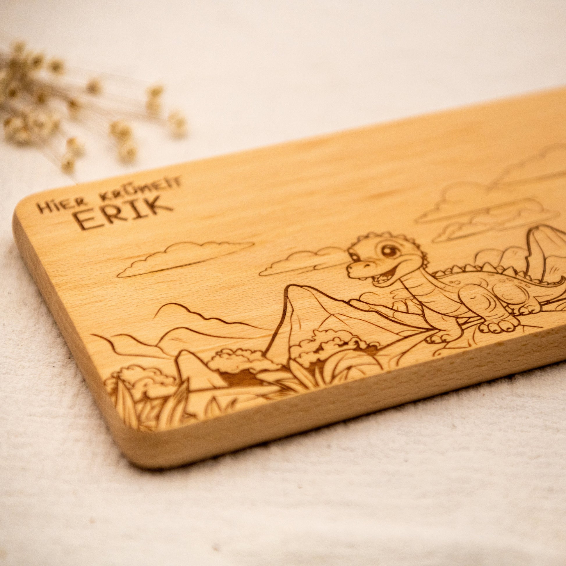 Frühstücksbrett personalisiert für Kinder mit Dinos als Kindergeschenk zur Geburt oder für werdende Eltern - Dinosaurier