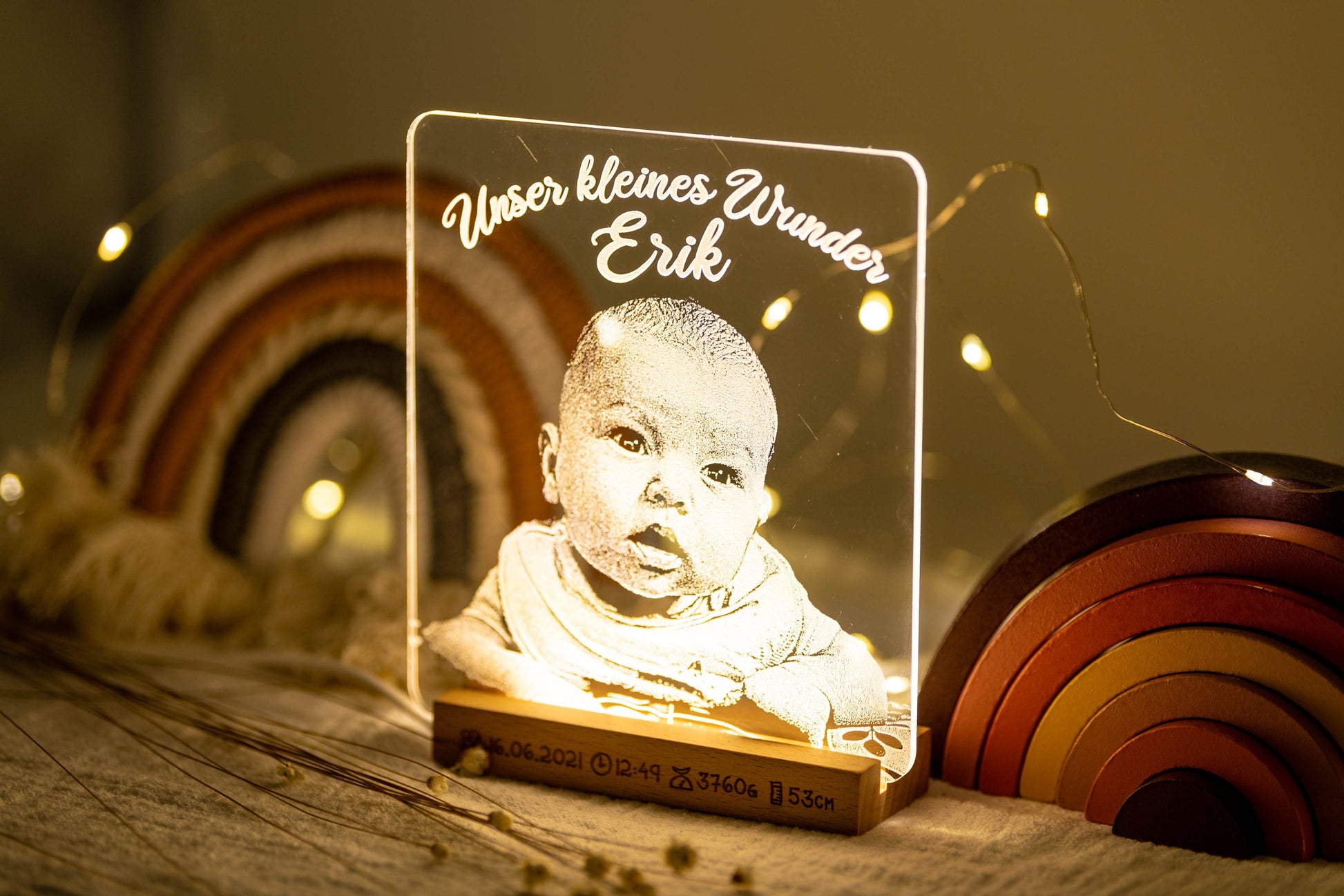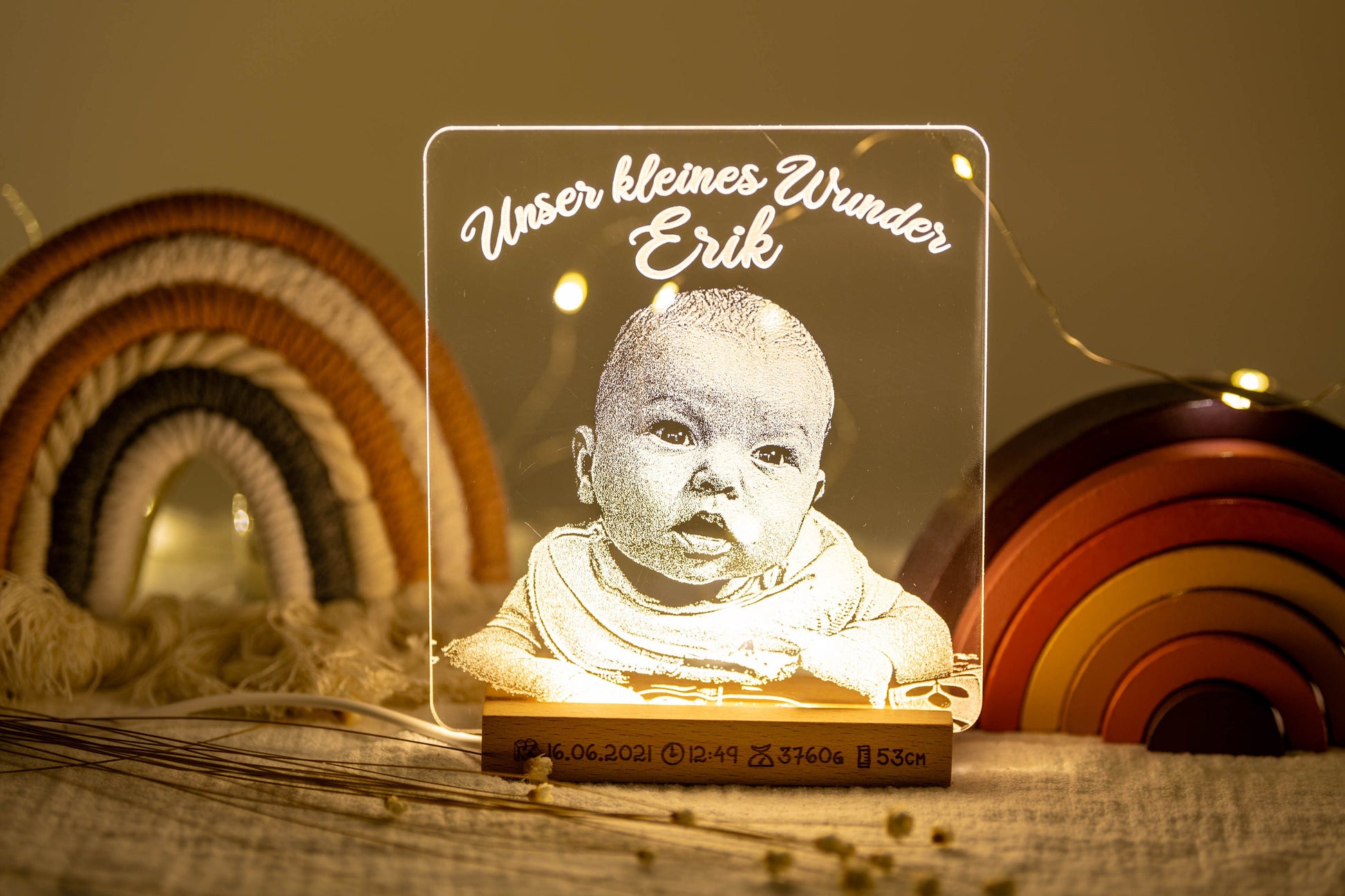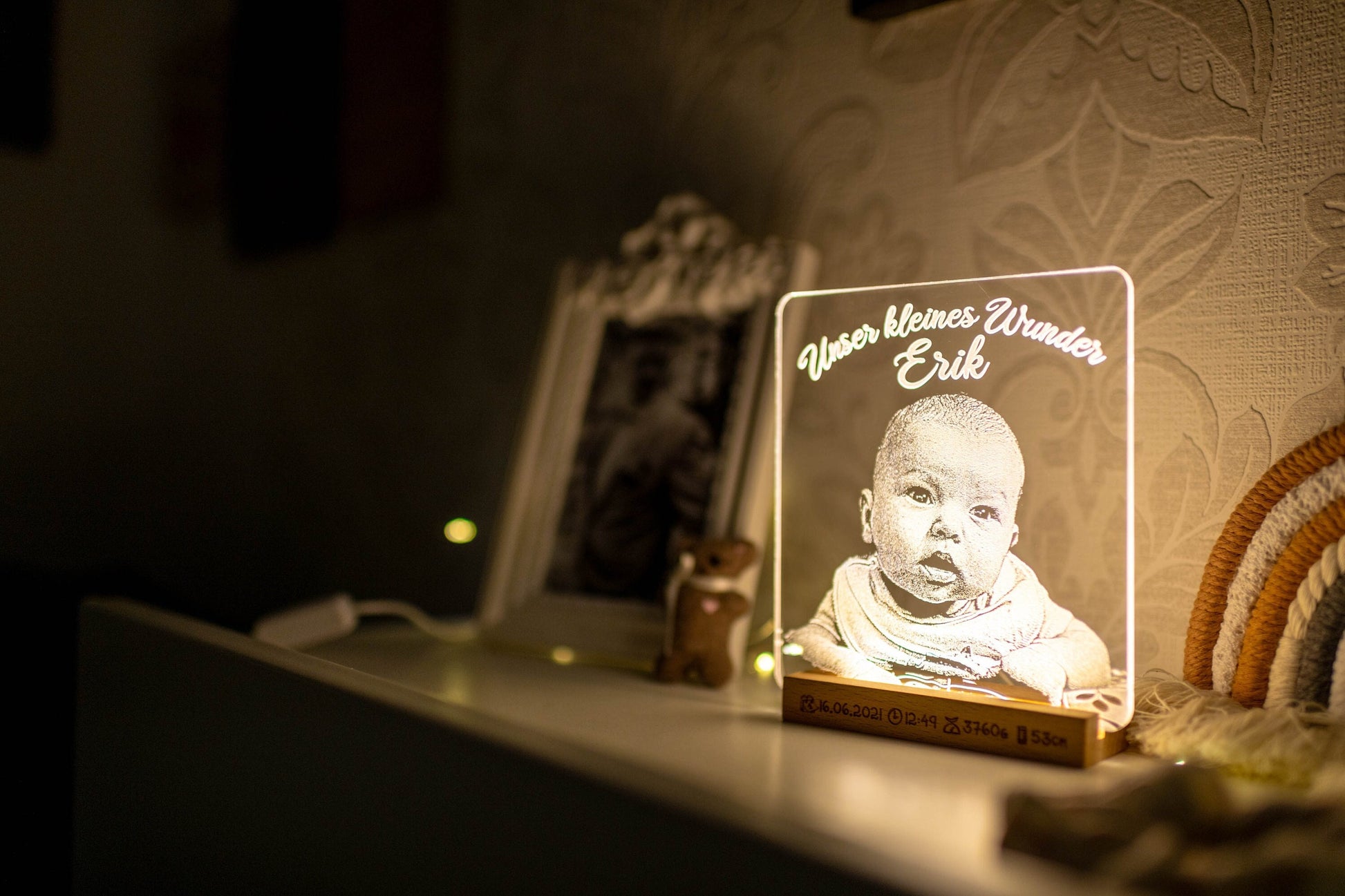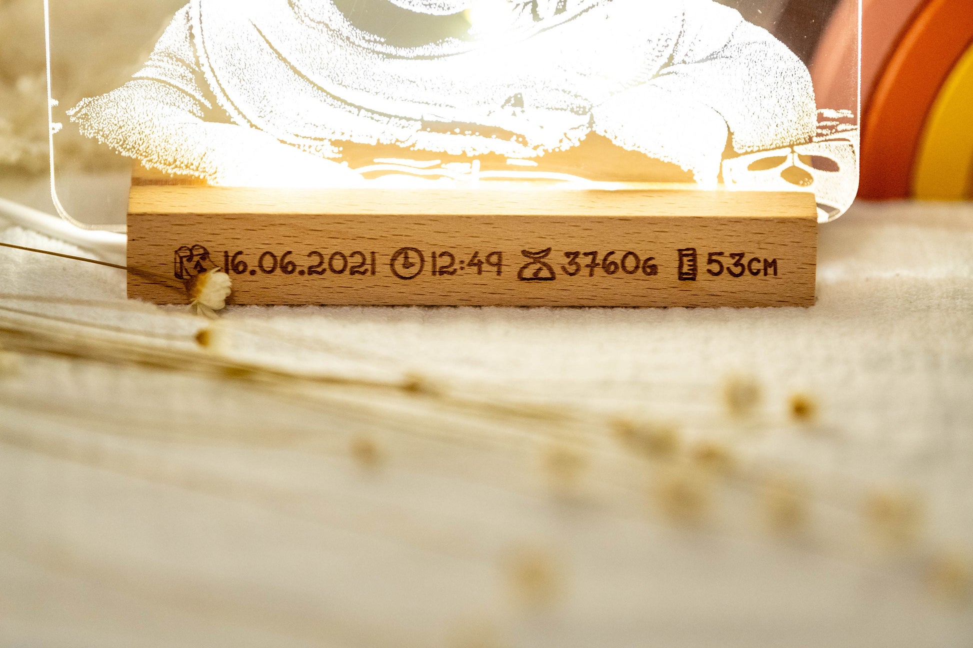 Bitte trage die Daten (Optional auf dem Sockel) in das Personalisierungsfeld ein. Sende uns dein Bild per Etsy oder Mail. Du erhältst eine Vorschau wie die Lampe aussehen wird, sowie ein Bild vor dem Versand.
