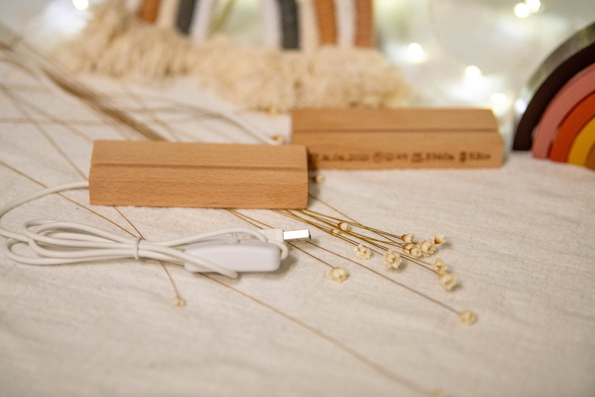 Der Sockel besteht aus Holz (Buche). Die LED Lampe wird mit einem USB-Kabel geliefert. Hier kann jedes herkömmliche Handyladegerät oder der Computer (USB) verwendet werden.